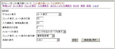 | デフォルト表示 | リストフレームのデフォルト表示を「ルート表示」、「スレッド表示」、「入力順表示」、「全グループ入力順表示」、「まとめ」、「検索」の中から選択できます。 |
